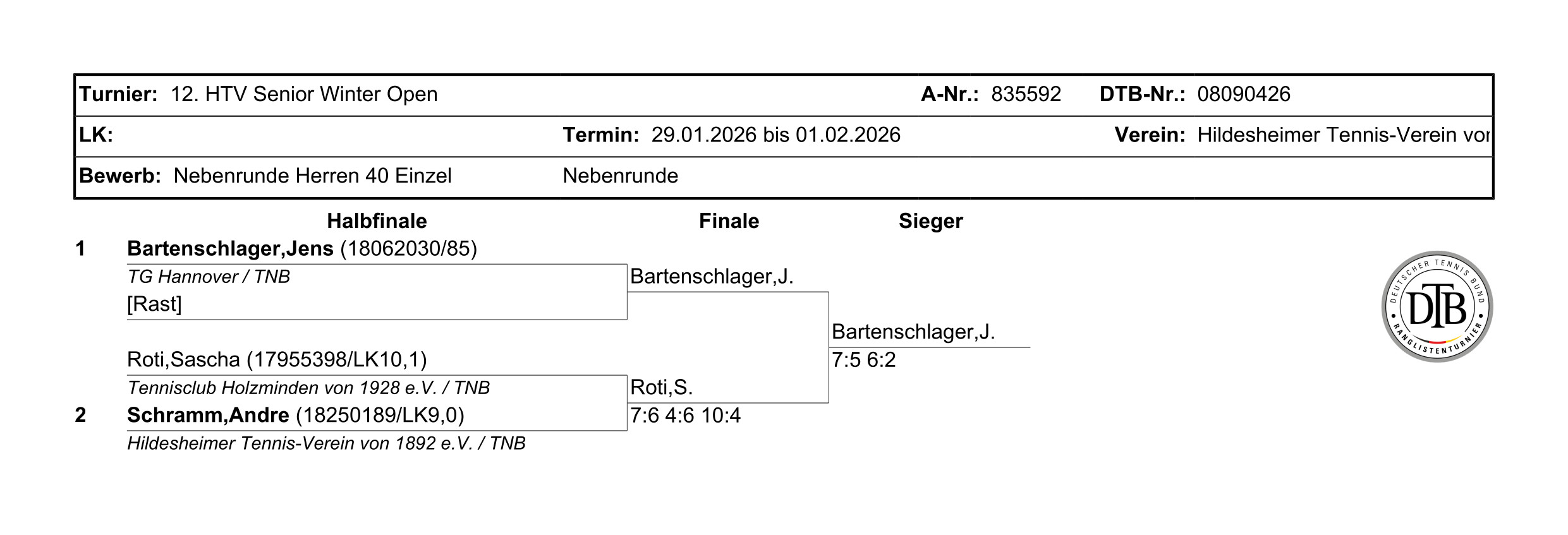 J. Bartenschlager (TG Hannover) - R. Sascha (Tennisclub Holzminden von 1928 e.V.) 7:5 6:2