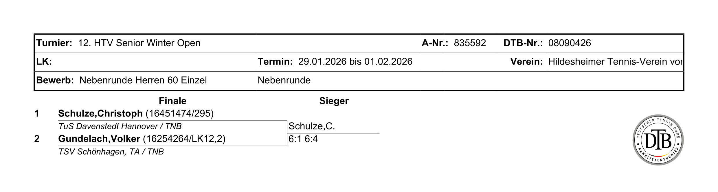 C. Schulze(TuS Davenstedt Hannover) - V. Gundelach (TSV Schönhagen) 6:1 6:4