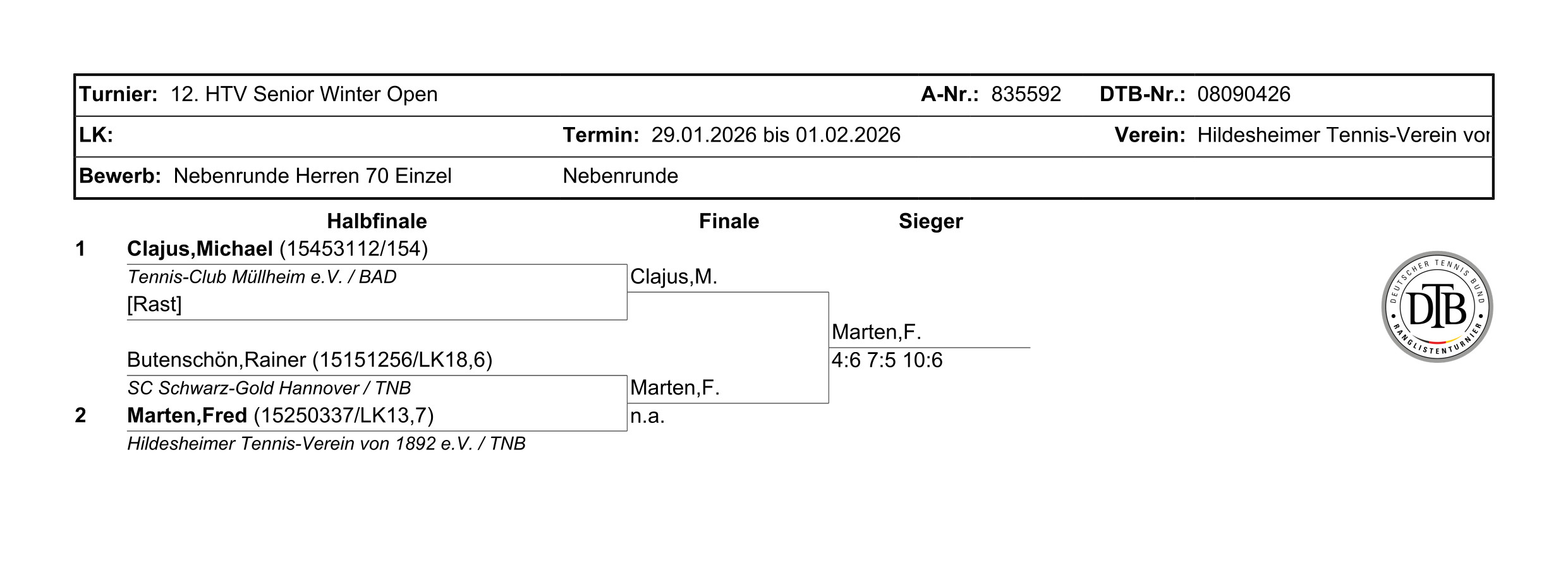 F. Marten (Hildesheimer Tennis-Verein von 1892 e.V.) - M. Clajus (Tennis-Club Müllheim e.V.) 4:6 7:5 10:06