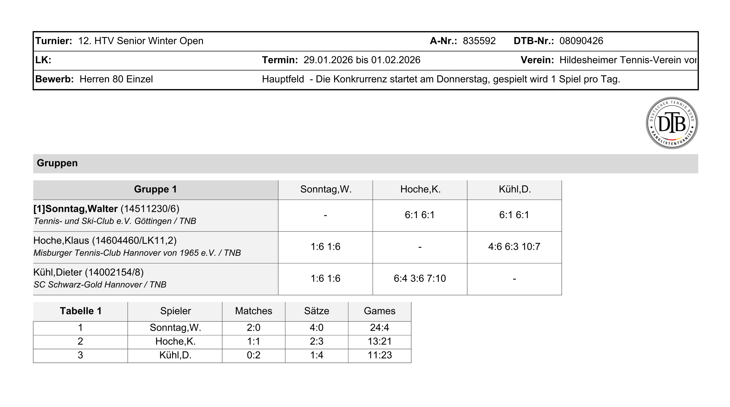 W.Sonntag(Tennis- und Ski-Club e.V. Göttingen ) - K. Hoche (Misburger Tennis-Club Hannover von 1965 e.V) 6:1 6:1