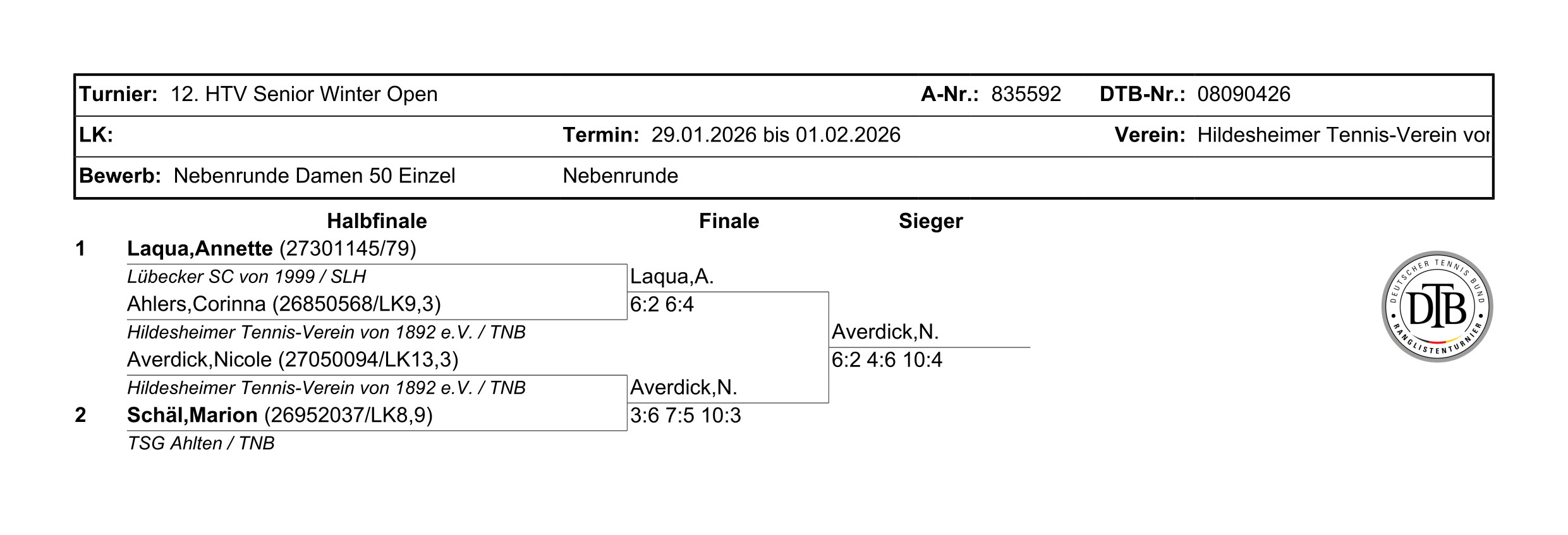 N. Averdick (Hildesheimer Tennis-Verein von 1892 e.V.)) - A. Laqua (Lübecker SC von 1999) 6:2 4:6 10:4