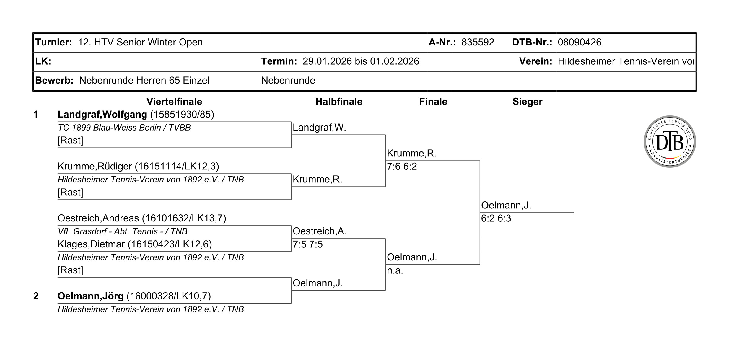 J. Oelmann (Hildesheimer Tennis-Verein von 1892 e.V.) - R. Krumme (Hildesheimer Tennis-Verein von 1892 e.V.) 6:2 6:3