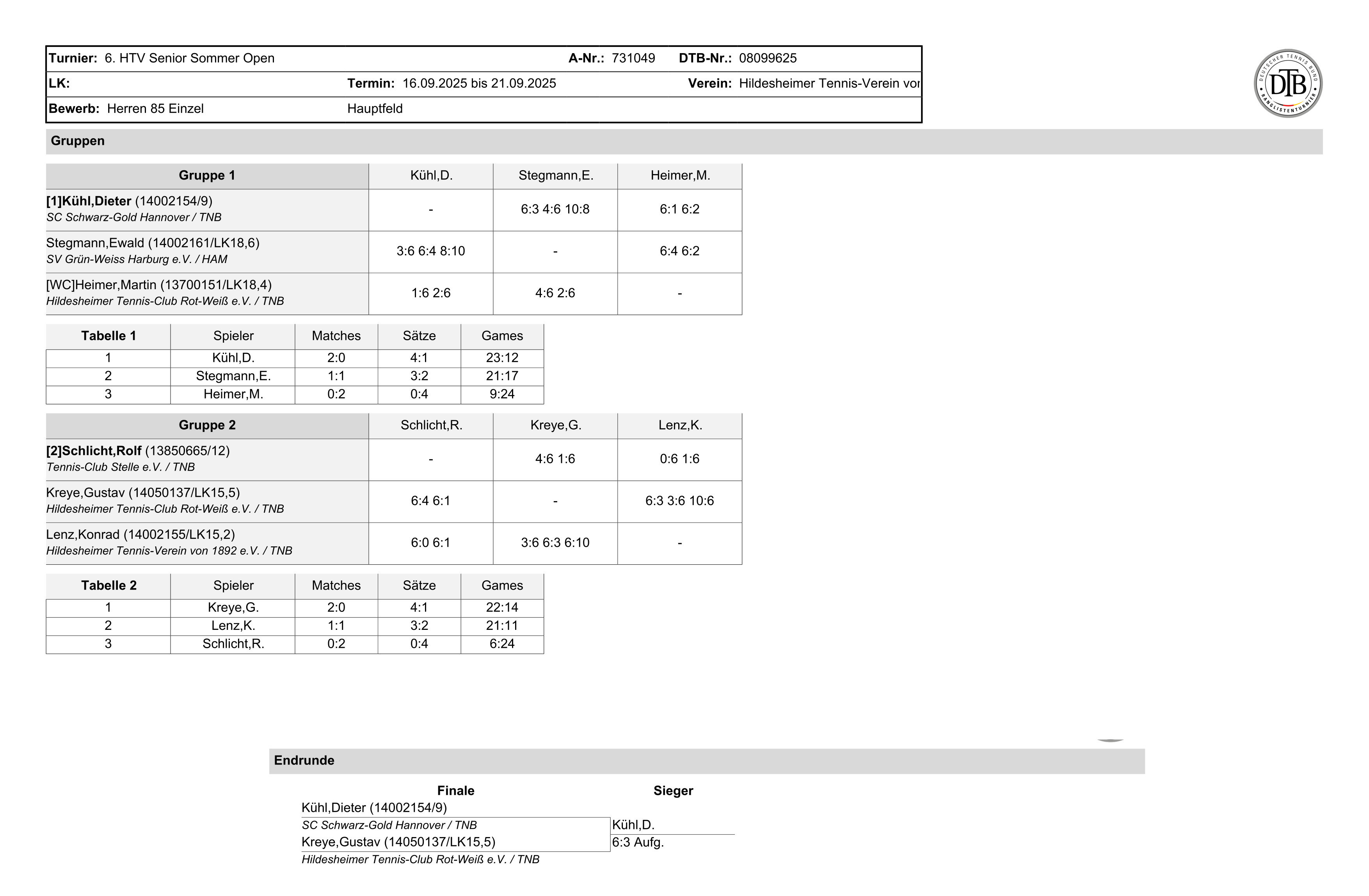 D. Kühl (SC Schwarz-Gold Hannover) - G. Kreye (Hildesheimer Tennis-Club Rot-Weiß e.V.) 6:3 Aufg.